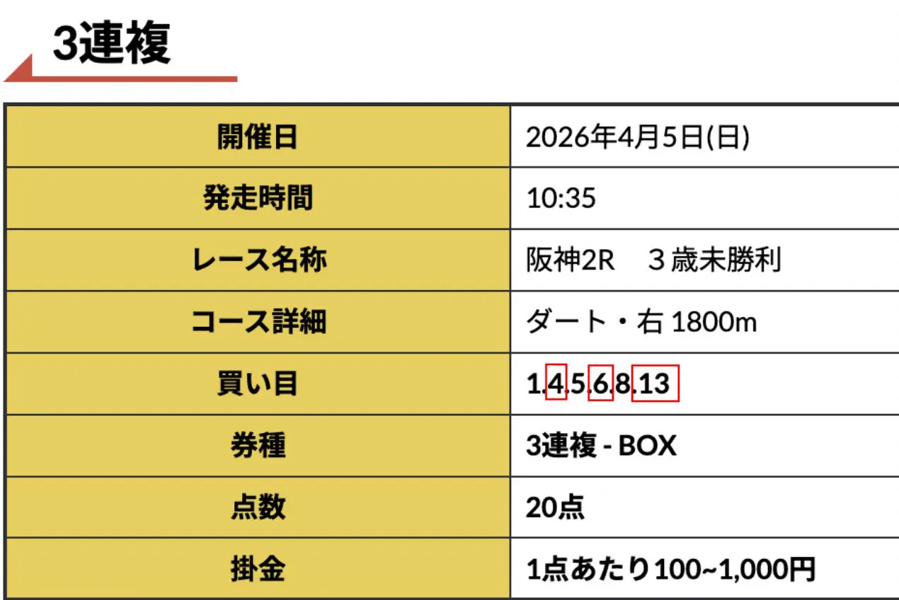 阪神2Rの無料予想で66,800円獲得!3連複の6頭BOXで4-6-13をしっかり仕留めてくれました。1点1,000円で買ってたから払い戻しもデカい。ここの無料情報の精度、マジで本物ですね。