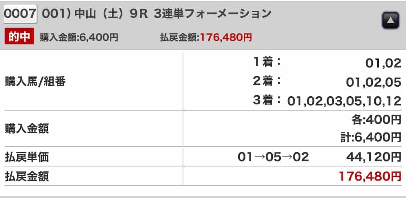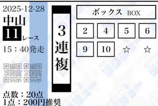 有馬は点数を広げがちですが、20点に絞ってこの配当は凄すぎる。推奨通り200円で買って、馬券代4000円が33,160円になりました! 情報の質が他とは違いますね。