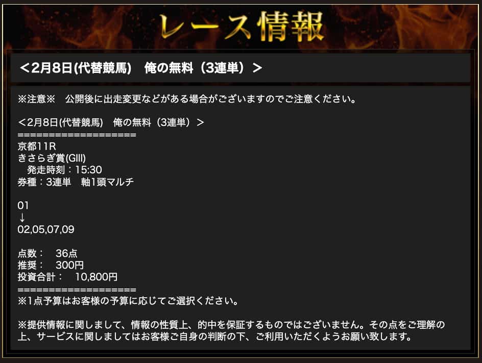 無料予想に1週間ベタ乗りしてみたけど、収支はボロボロ。選んでいる馬が人気薄でもなんでもないガチガチの本命なのに、平気で馬券圏外に飛ぶ。プロの予想を名乗るなら、せめて素人でも当てられるようなレースくらいは的中させてほしい。情報の質が低すぎる。