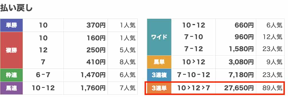 11/09京都12R | 馬単 | 6,000円 | 28,300円 | 471% |