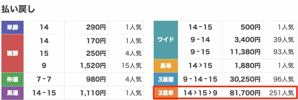 09/16/中山4R | 馬単 | 6,000円 | 85,400円 | 1,423% |