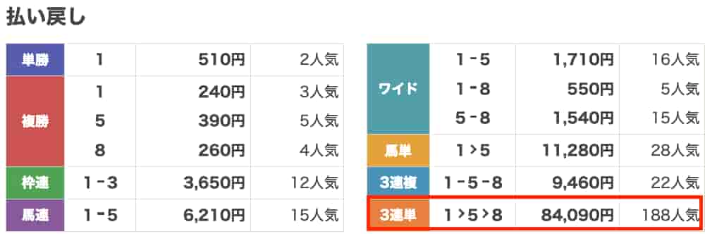 05/10(土)京都8R3連複6,000円61,800円1,030%