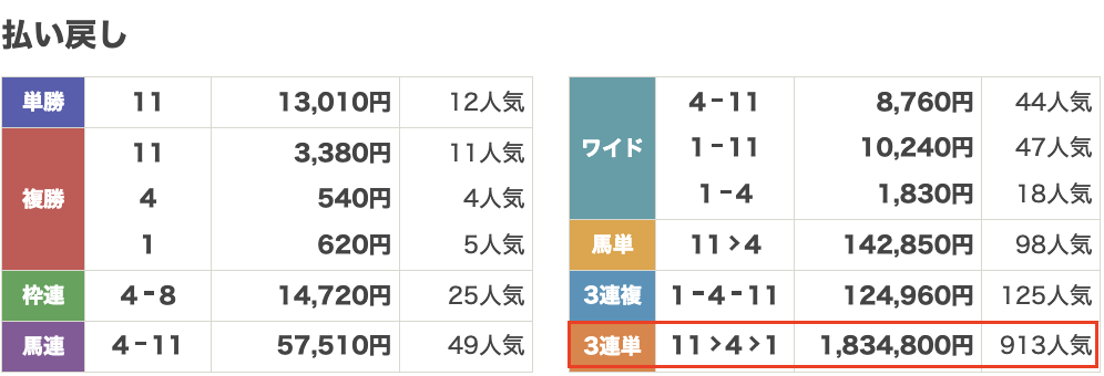 無料情報が当たったので、思い切って有料の血統馬券術に参加。結果は3連単11-4-1的中。1点200円が366万9,600円に化けました!回収率4万%超えとか、自分でも信じられない数字です。ここはマジで別格。一発逆転狙うなら絶対ここ。