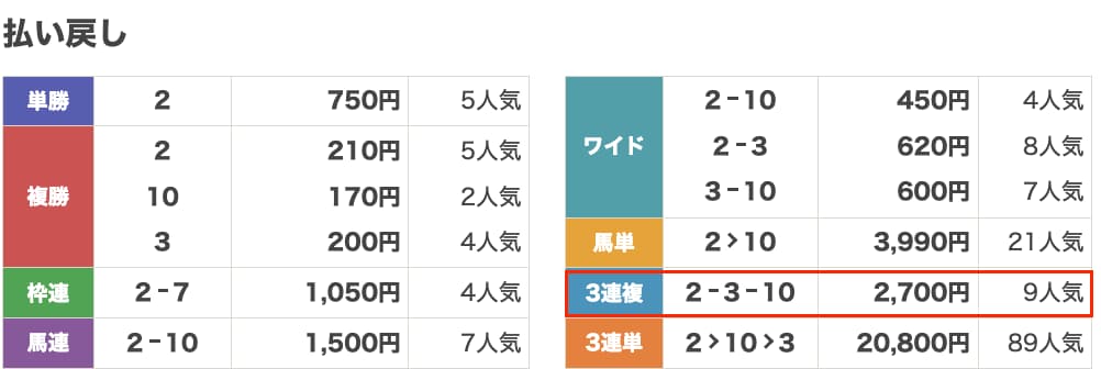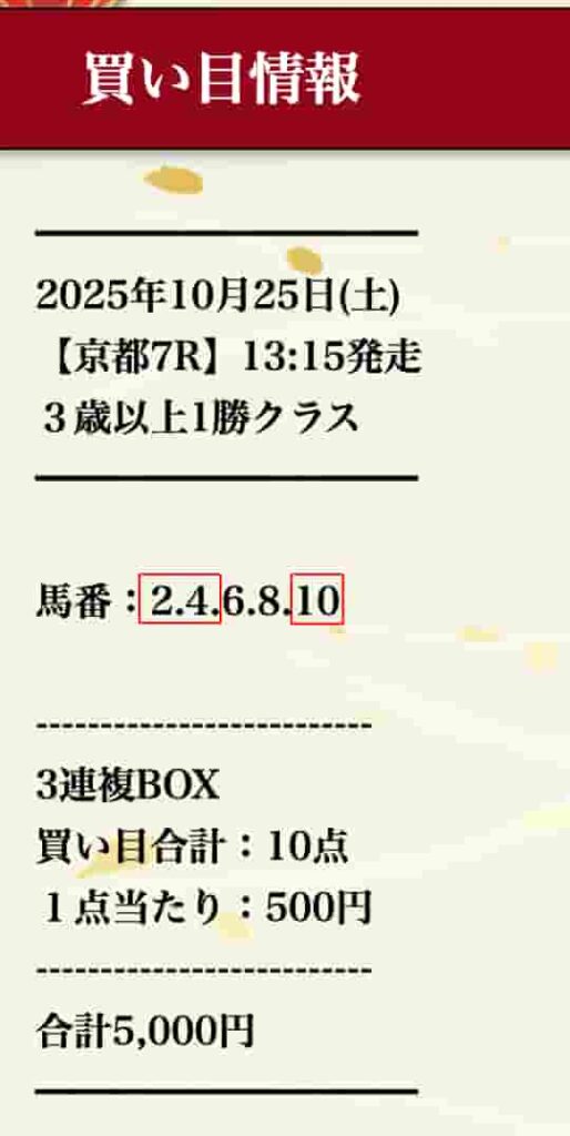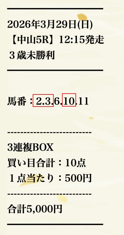 | 馬券代 | 1点1000円✖️10点 10.000円 |