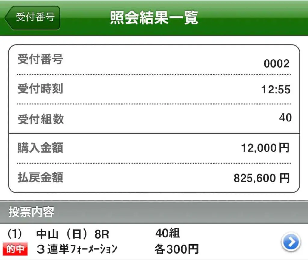 | 馬券代(1点300円✖️40点) | 12,000円 |
