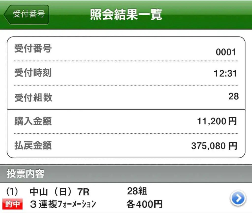 | 馬券代(1点400円✖️28点) | 11,200円 |