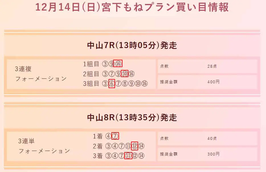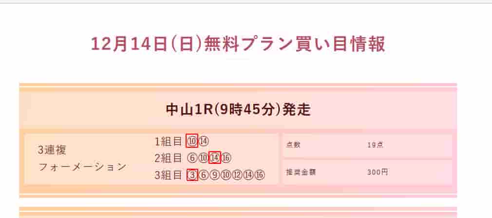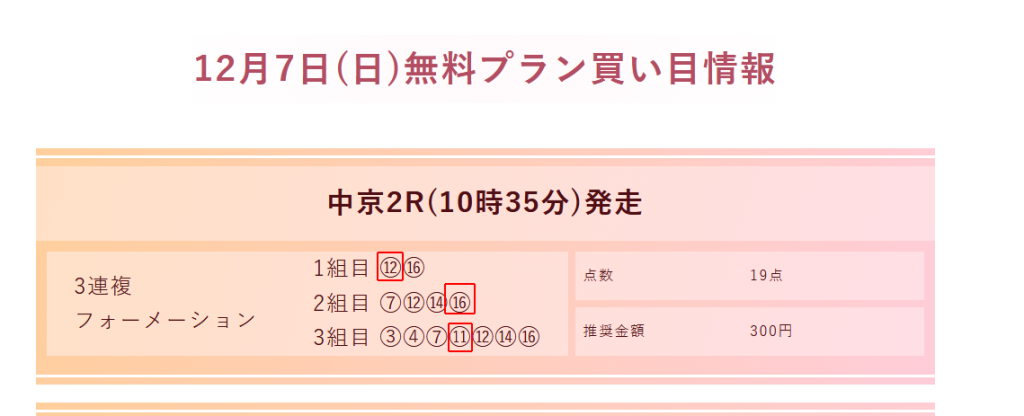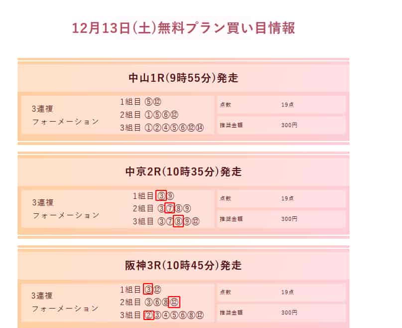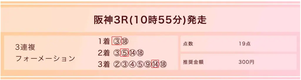 先週の無料プラン、的中率が抜群!中京2Rで3万9810円、阪神3Rで5万3580円の払い戻しがあり、無料でも高額リターンを得られました。買い目の精度が高く、今後も注目したいです。