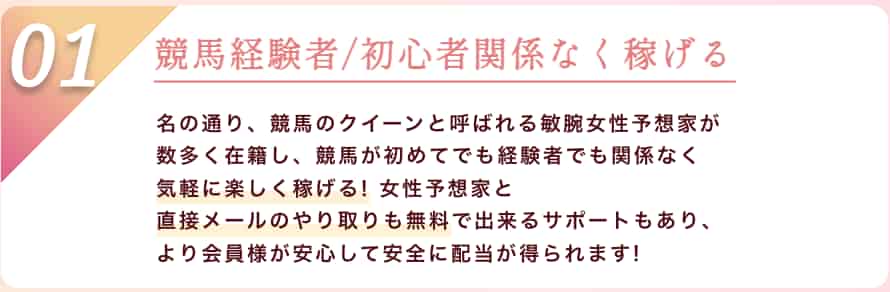 「競馬クイーン」は、競馬初心者から経験者まで誰でも気軽に稼げる競馬予想サイトです。