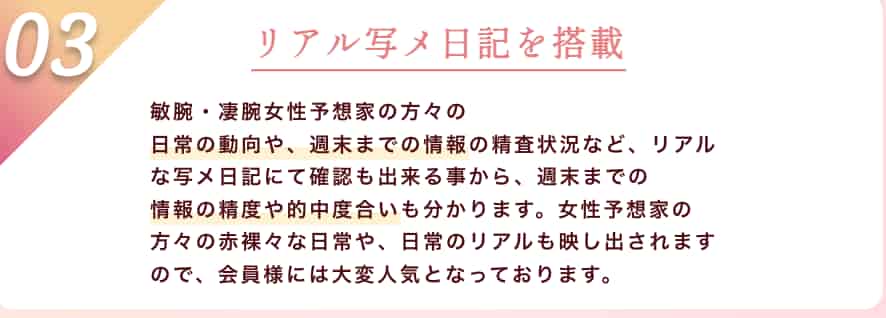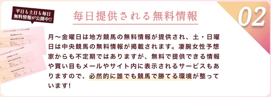月~金曜日は地方競馬、土・日曜日は中央競馬の情報が掲載され、無料でも十分に勝てるチャンスが広がっています。また、女性予想家の日常や情報精査状況をリアルな写メ日記で確認でき、信頼性と安心感がさらにアップ!