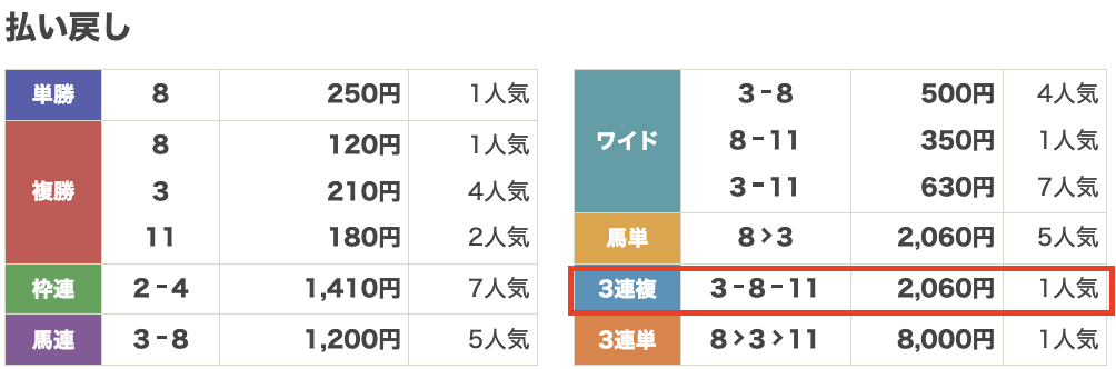 盛岡3Rの3連複、ちゃんと【2-3-8】で的中してて、しかも12,090円の配当…。
