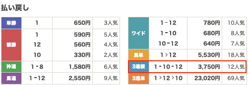| 払い戻し | 3,750円 |