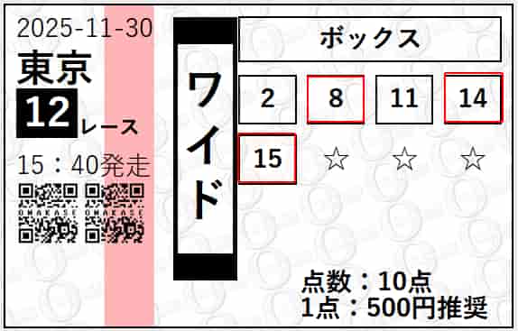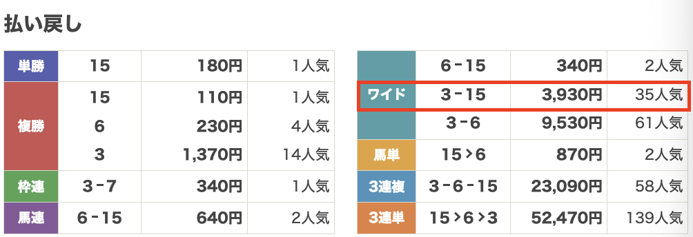 | 払い戻し | 8 – 15 →520円 8 – 14→740円 14 -15→320円 |