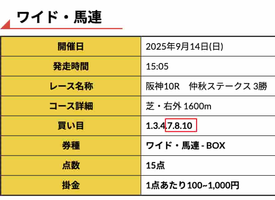 | 馬券代 | 1点1000円✖️10点=10,000円 |