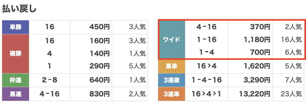 | 払い戻し金額 | 4 – 16→370円 1-16→1,180円 1-4→ 700円 |