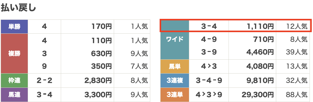 3-9ワイド、4,620円ってマジか…。BOXで買ってたけど、これは美味しすぎる。馬券代10,000円で46,200円戻ってくるなんて、こういうのがあるからやめられない。
