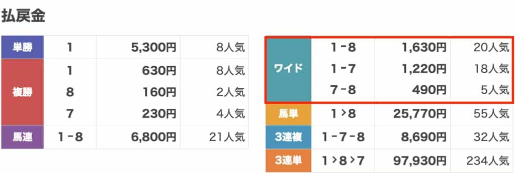 | 払い戻し | 1-8→1,630円 1-7→1,220円 7-8→490円 |