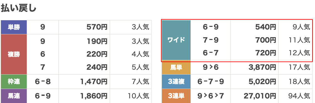 | 払い戻し | 6-9→540円 7-9→700円 6-7→720円 |