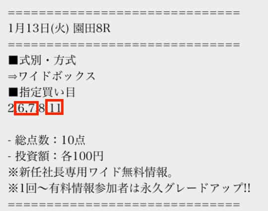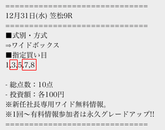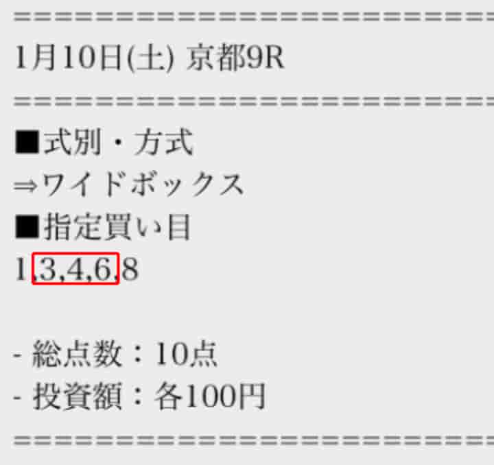 新潟8RでワイドBOX的中!10,000円投資して13,080円戻り。無料でこれだけ回収率が出るなら、有料予想はどうなるのか気になってきました…。少額でもプラスになったので、次は本格的にチャレンジしてみようかなと思います。」
