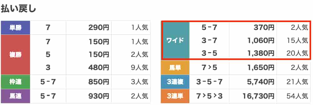 | 払い戻し | 5-7→370円 3-7→1,060円 3-5→1,380円 |