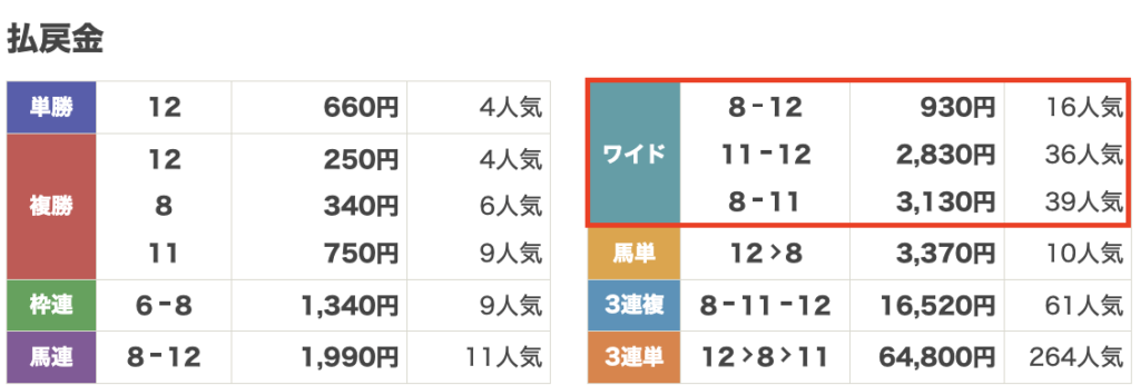 | 払い戻し金額 | 8 – 12→930円 11-12→2,830円 8-11→3,130円 |
