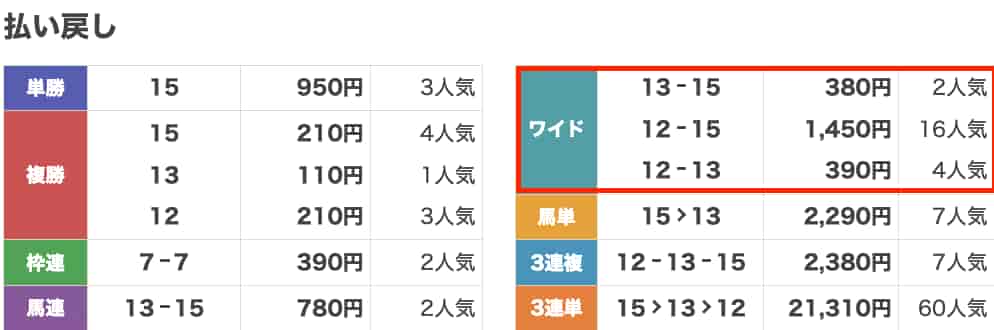 | 払い戻し金額 | 13-15→380円 12-15→1,450円 12-13→390円 |