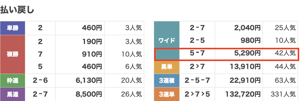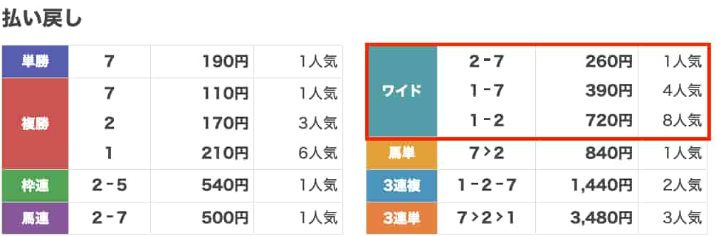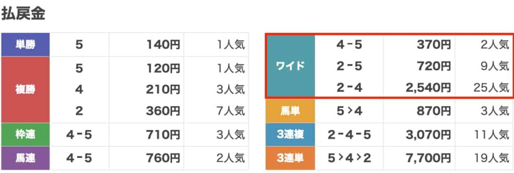 ワイドBOX10点で【1-3】【3-5】【1-5】が全部的中。