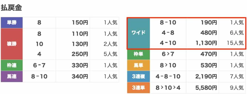 払い戻し金額 | 4-8→480円 4-10→1,130円 | 8-10→190円
